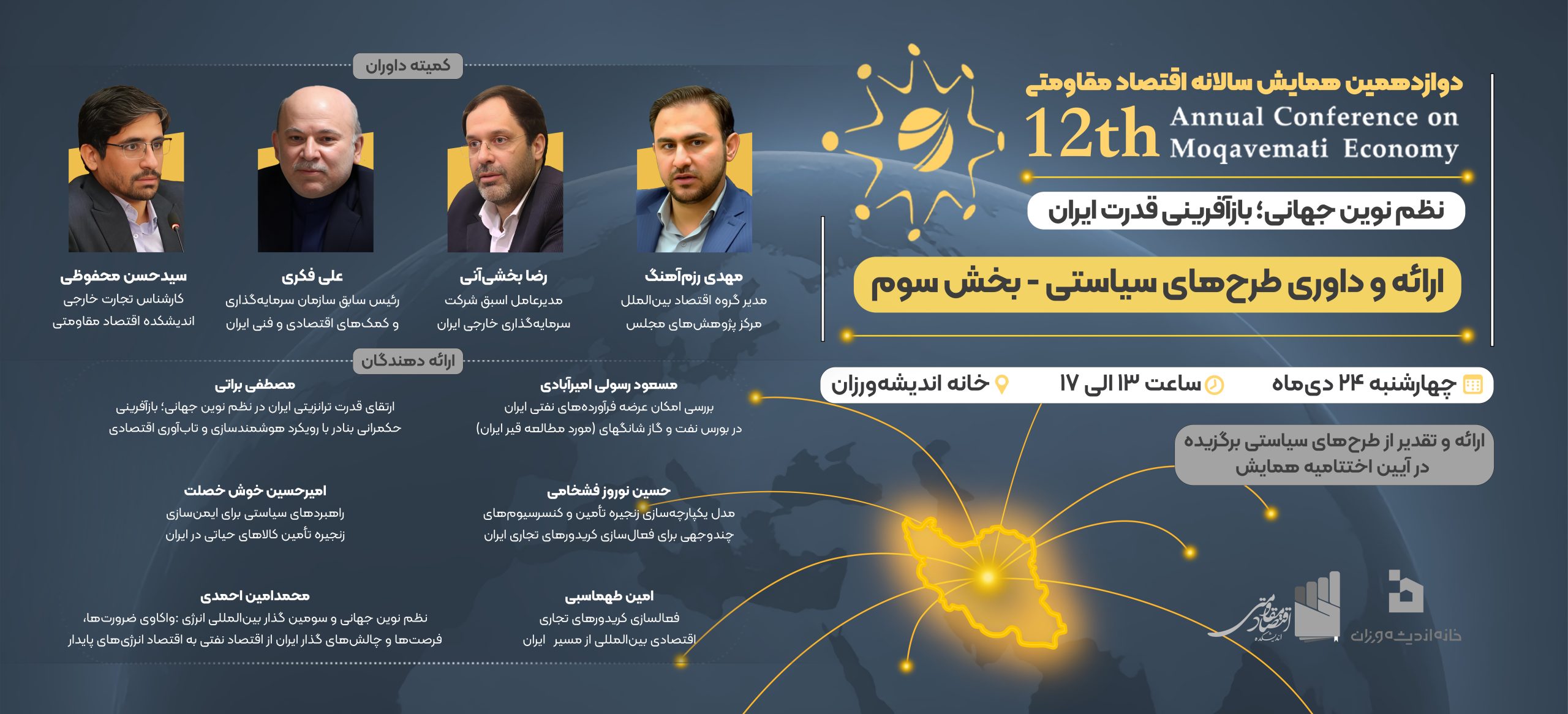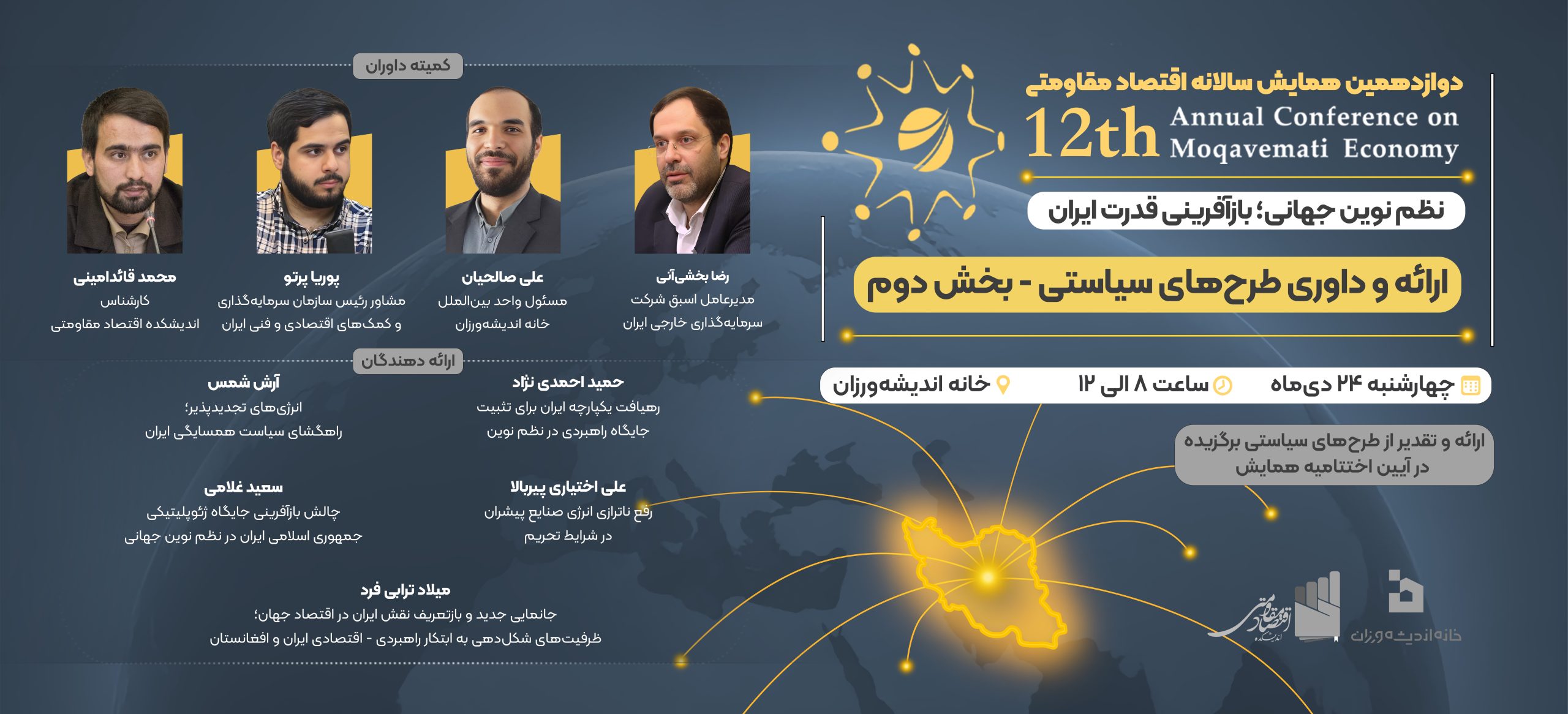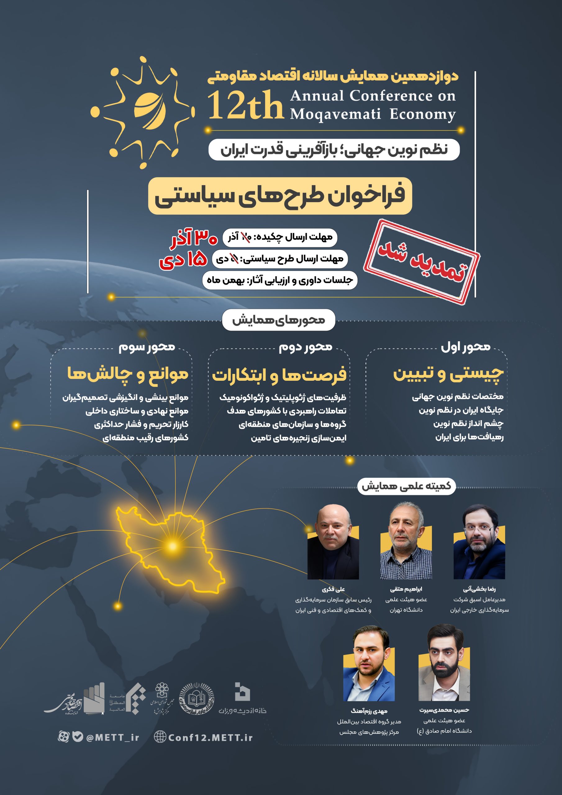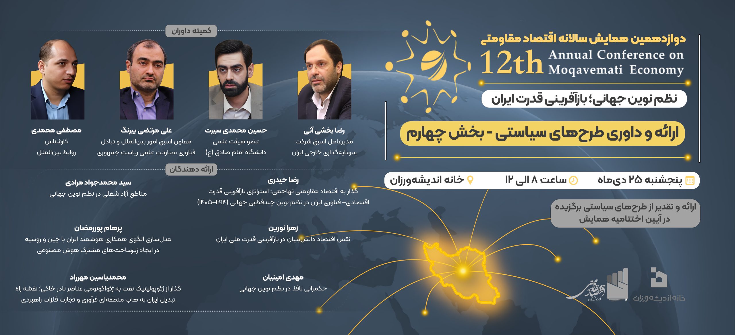 اختتامیه دوازدهمین همایش سالانه اقتصاد مقاومتی با موضوع «نظم نوین جهانی؛ بازآفرینی قدرت ایران» در تاریخ ۱۴۰۴/۱۱/۲۸ و همزمان با سالروز ابلاغ سیاستهای اقتصاد مقاومتی برگزار میشود.