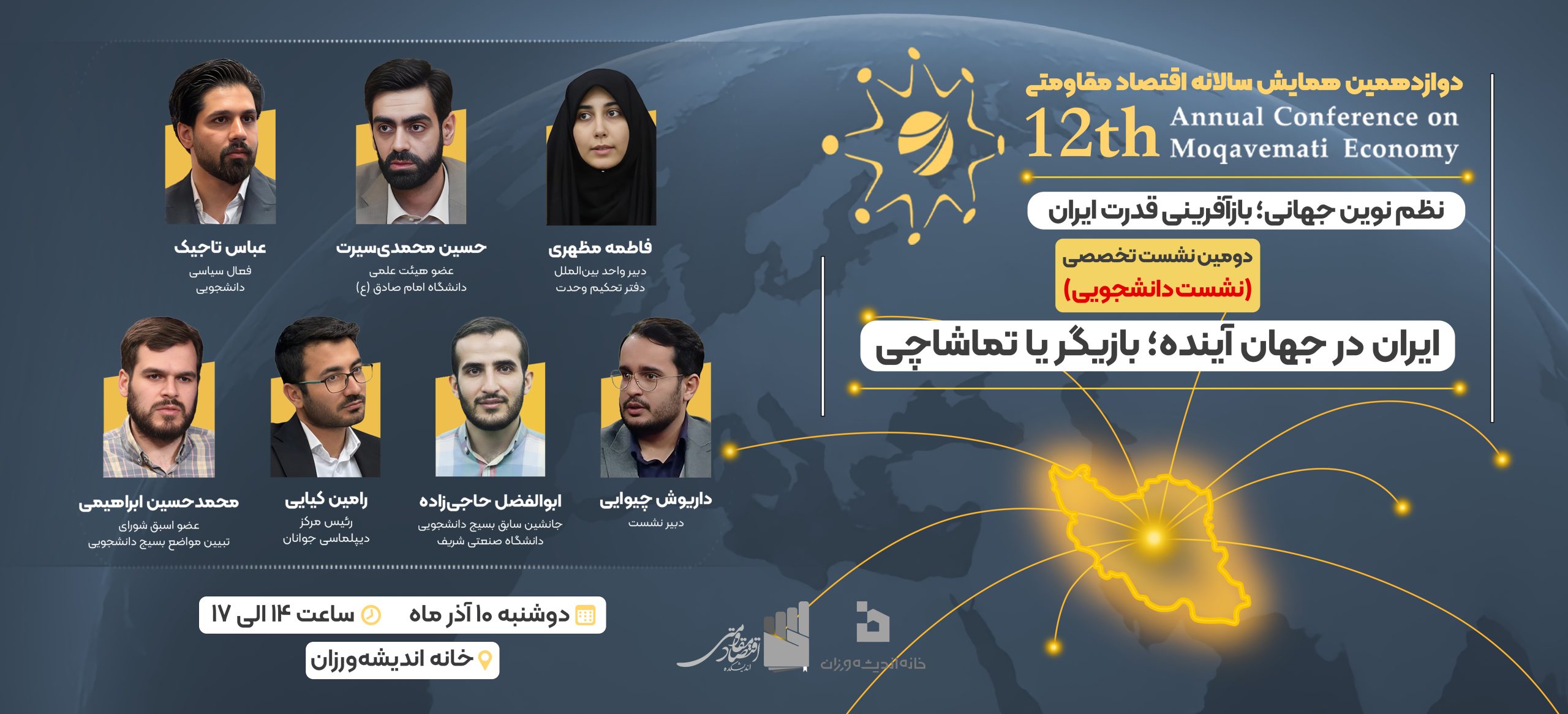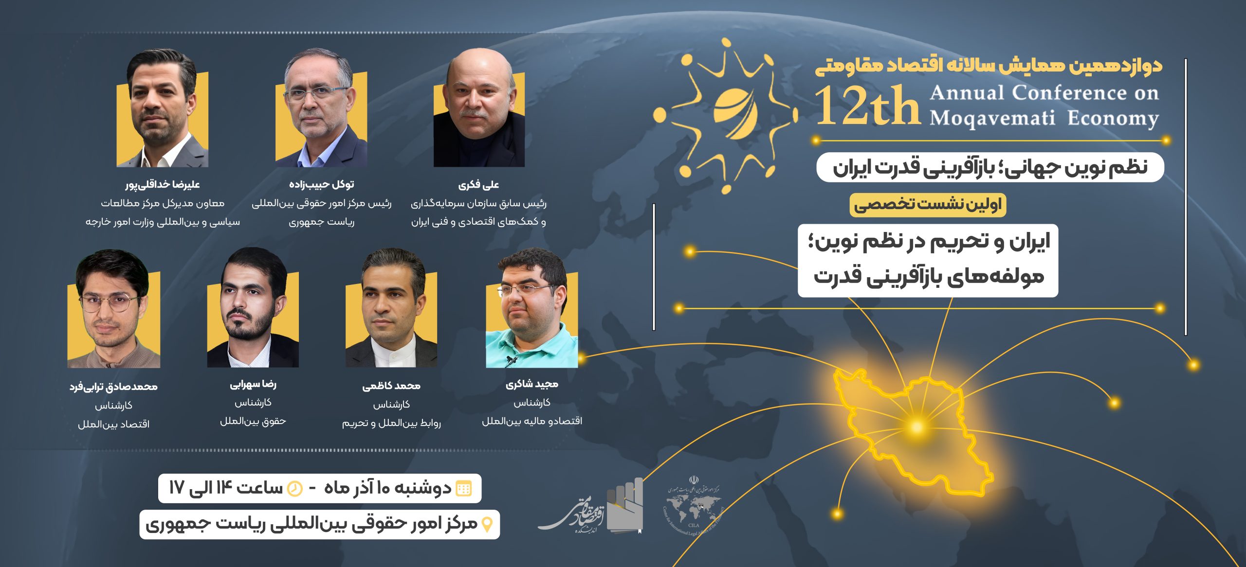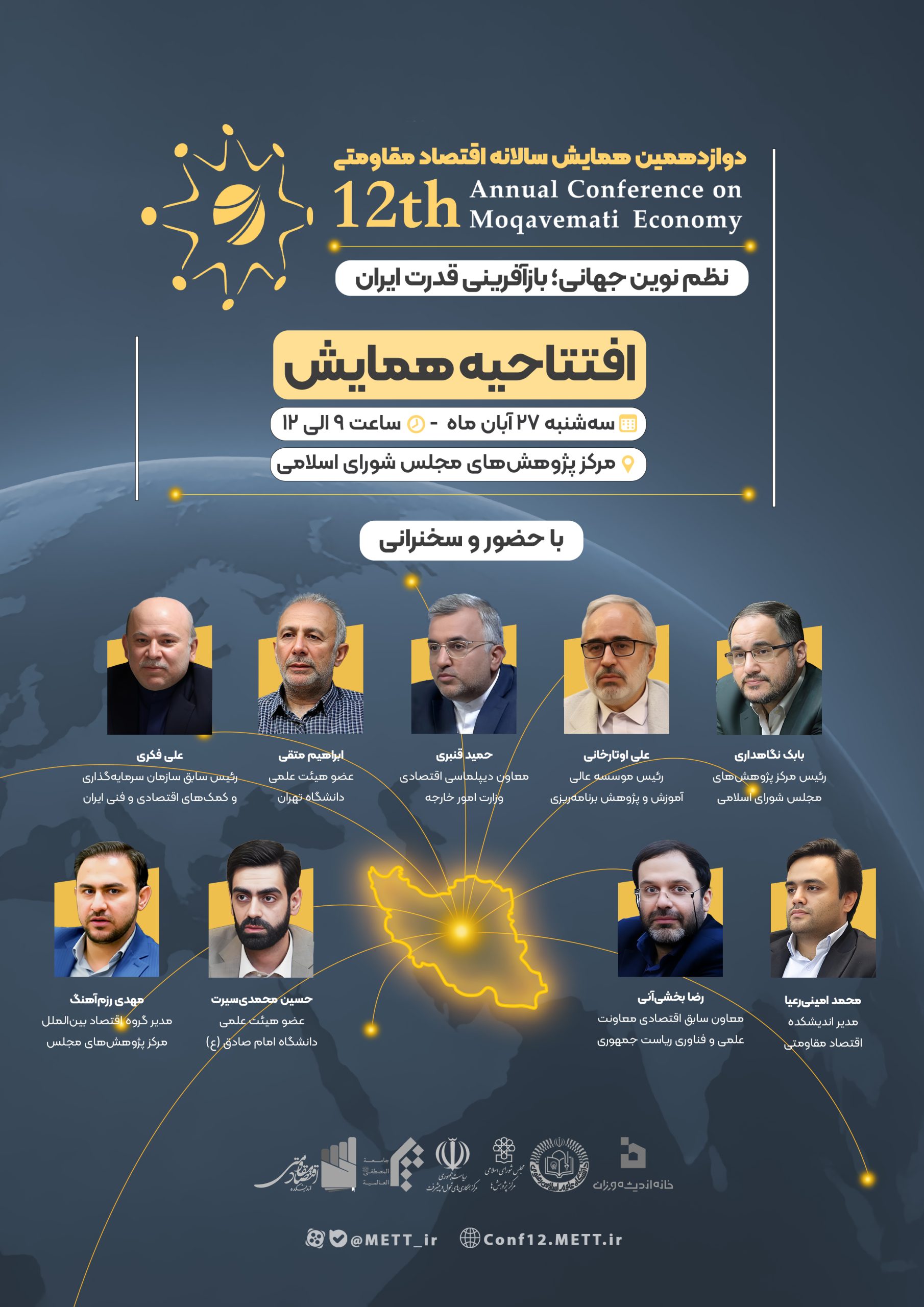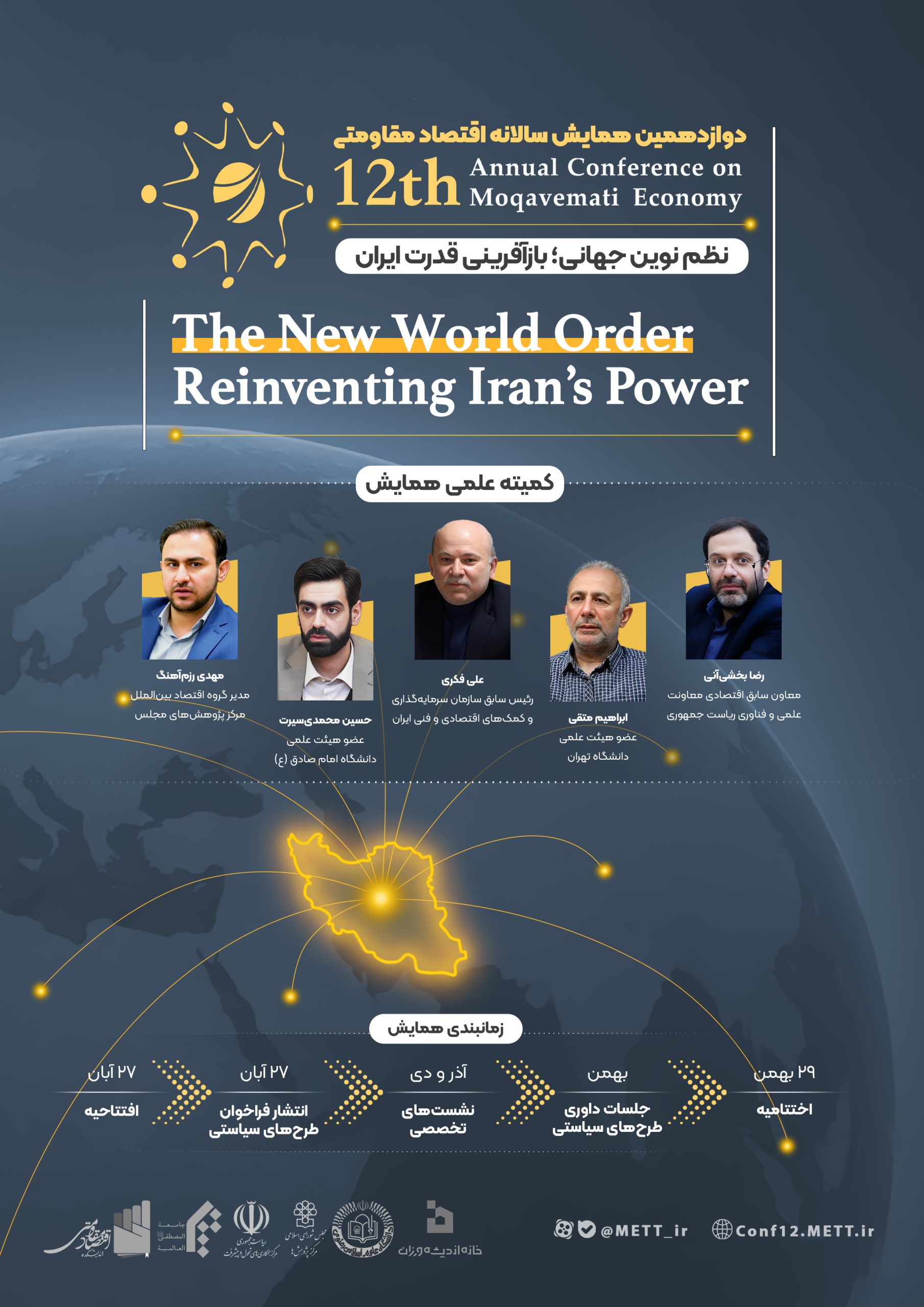 اختتامیه دوازدهمین همایش سالانه اقتصاد مقاومتی با موضوع «نظم نوین جهانی؛ بازآفرینی قدرت ایران» در تاریخ ۱۴۰۴/۱۱/۲۹ و همزمان با سالروز ابلاغ سیاستهای اقتصاد مقاومتی برگزار میشود.