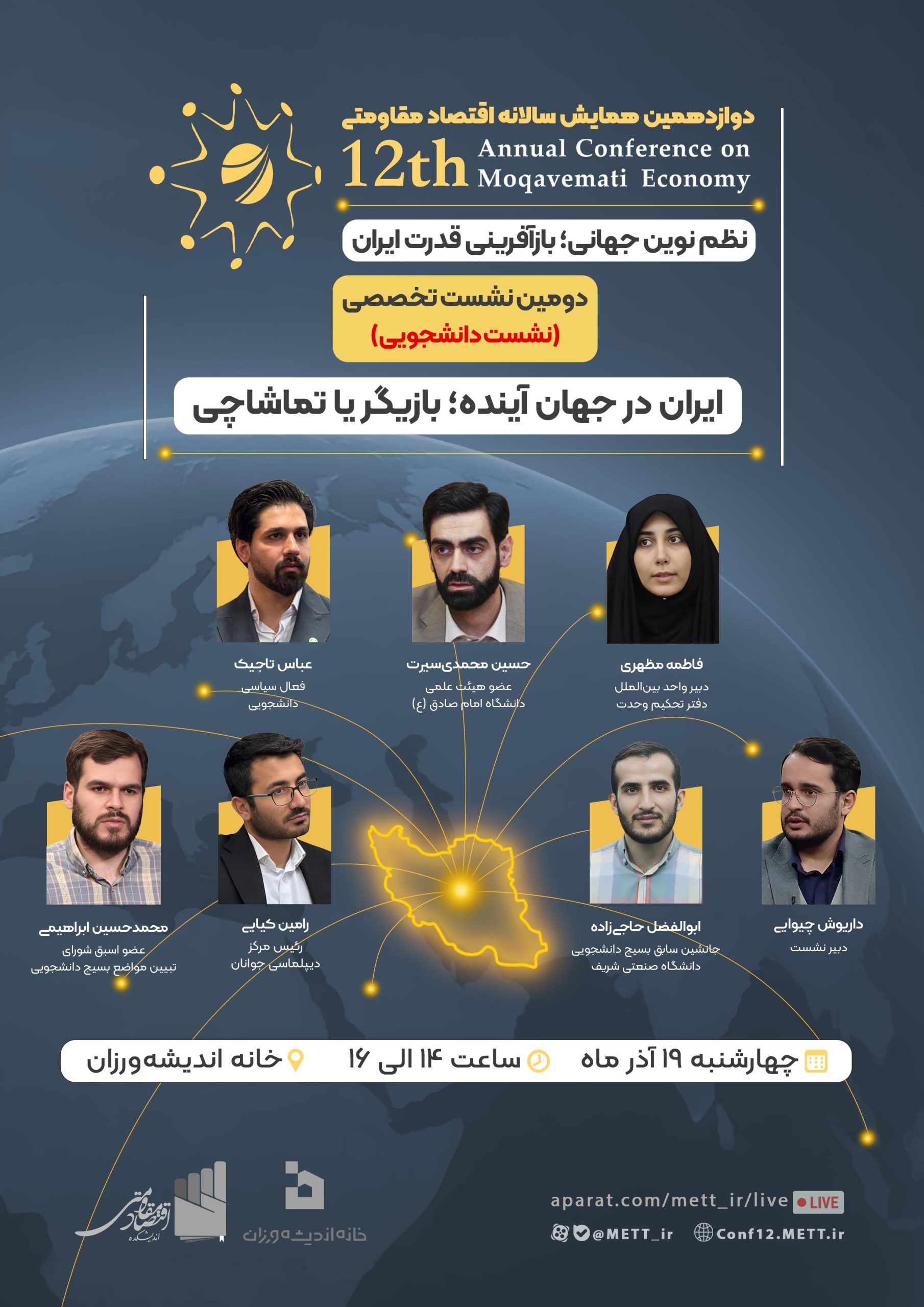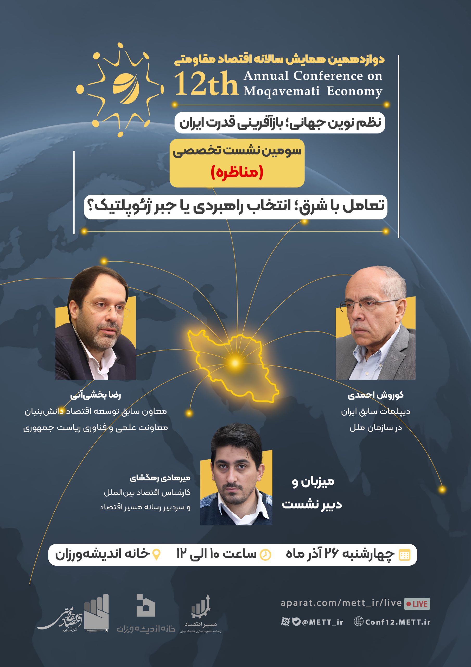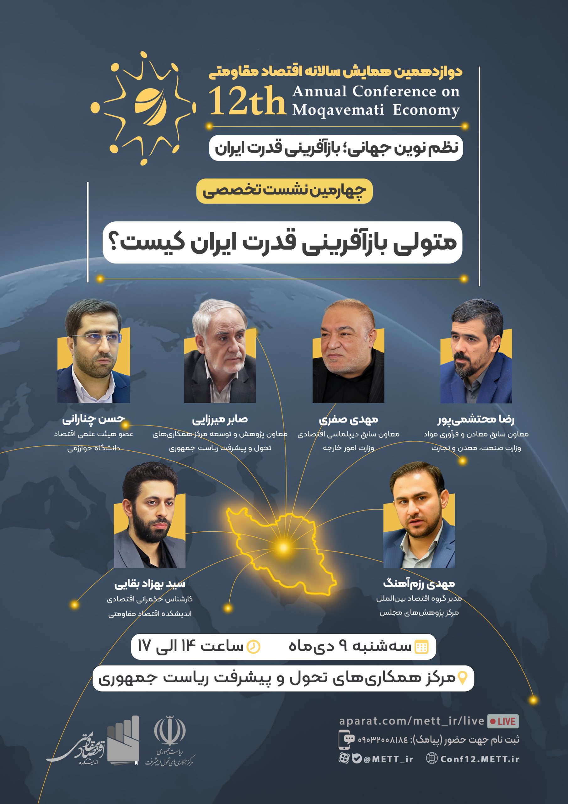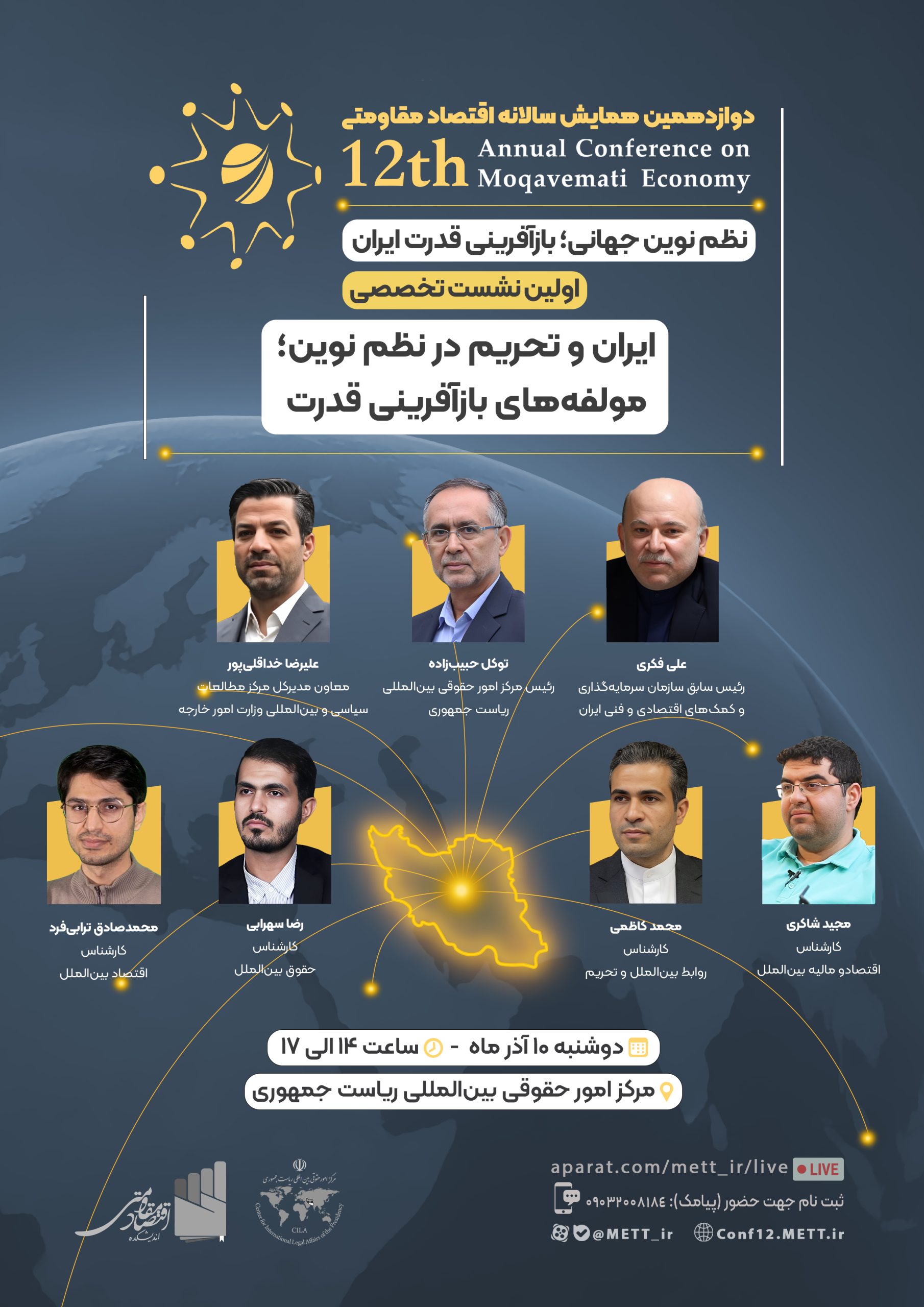 اختتامیه دوازدهمین همایش سالانه اقتصاد مقاومتی با موضوع «نظم نوین جهانی؛ بازآفرینی قدرت ایران» در تاریخ ۱۴۰۴/۱۱/۲۹ و همزمان با سالروز ابلاغ سیاستهای اقتصاد مقاومتی برگزار میشود.